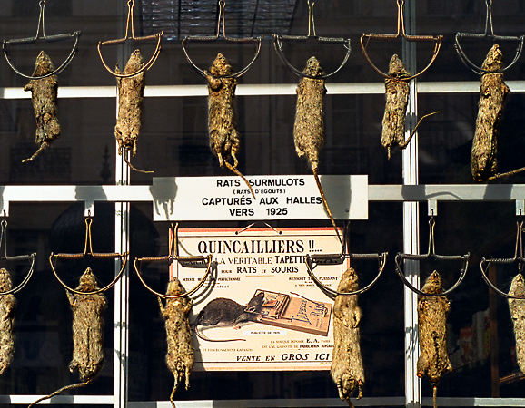 The window of the «Destruction des Animaux Nuisibles» shop run by the Aurouze family at 8, rue des Halles. The business was started in 1872 by par Étienne Aurouze with the name «Au renard blanc» and has always had a window display like this. I make mouse pads of this photograph, write me a note if you would like one of your own.