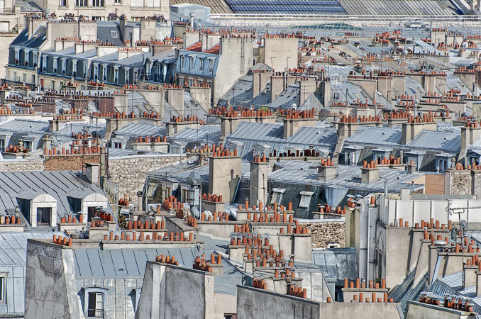 A view looking southwest over buildings in Paris, seen from Basilica Sacré-Cœur: zinc rooftops covered by forests of clay chimney pots; in the distance is the rooftop of gare du Nord.