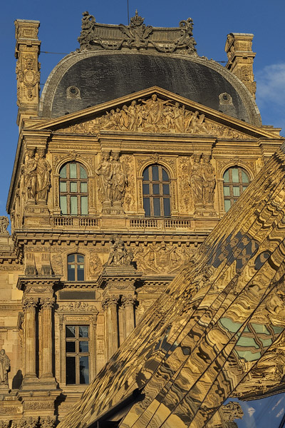 The musée du Louvre’s Richelieu pavillon reflected in the museum’s glass pyramid at sunset. Inside the triangular pediment is a scene entitled “France protecting Science and Art”, by sculptor Francisque Duret.
