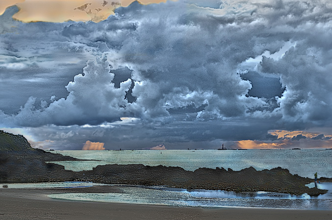 Des trombes de lumière couleur saumon brillent sur la place de Sillon, la vue vers le nord-ouest et le Fort de la Conchée, l’île Cézembre et le phare du Grand Jardin, vus de la chaussée du Sillon à Saint-Malo.