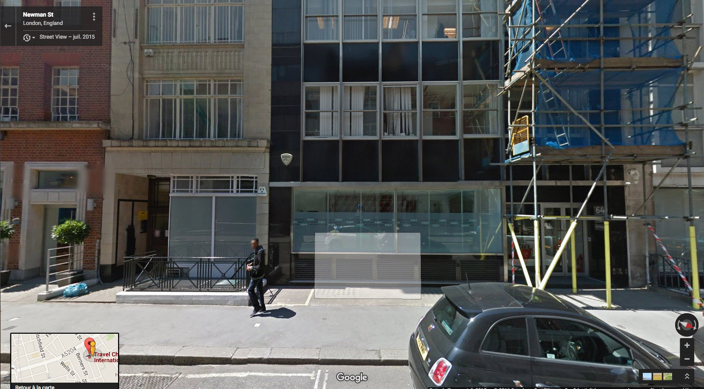 64 Newman Street in London, as shown on Google Street View in April 2016. I don’t really know much about London though looking at the over all map of the city it seems that 64 Newman Street could much more clearly be said to in the central west sector of London.