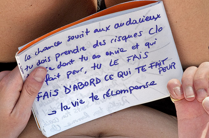 A girl writing odd things in her diary on quai d’Orléans: «La chance sourit aux audacieux, tu dois prendre des risques [illisible] dont tu as envie et que te fait peur, tu le fais, Fais d’abord ce que te fait peur, la vie te récompense»: “Luck smiles on the audacious, you must take risks [illegible] in what you desire and what frightens you, you do it, do first what scares you, life will reward you”.